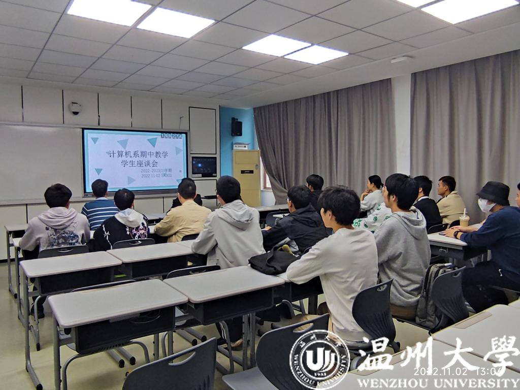 为进一步了解本学期学生学习状况,加强教学管理,提升教学质量,促进师生沟通,2022年11月02日下午1点,计算机系在5A303教室召开了本学期期中师生座谈会,参加座谈会的有陈伟斌老师、芦明老师、林小燕老师、邓若曦老师,以及19~22级计算机专业的班委和学生代表近20名同学,会议由计算机系主任陈伟斌老师主持。
