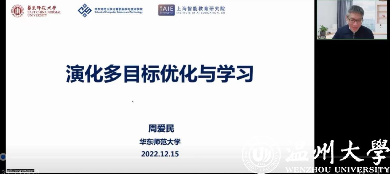 2022年12月15日,华东师范大学计算机科学与技术学院周爱民教授受艳母 邀请作题为“演化多目标优化与学习”的学术沙龙讲座。讲座由副院长陈慧灵主持,60余位相关领域人员参会。因疫情防控需要,本次讲座以线上形式进行。