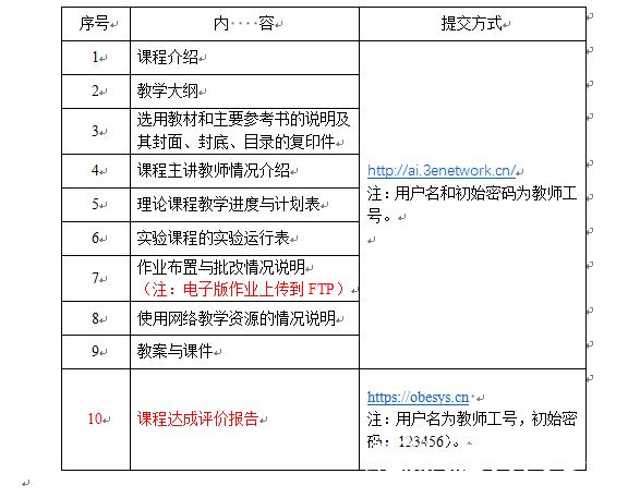 2021-2022-2学期课程结束后,请将本科课程教学档案上传到艳母 课程档案系统(//ai.3enetwork.cn/,课程教学档案清单详见表1),其中,电子版作业上传到ftp://10.132.219.5:2019的“2021-2022-2课程作业”文件夹中(命名格式:班级+课程名+姓名),纸质版作业每个评分等级各交2份到教务科胡孙贵老师处;课程达成评价报告需登录毕业要求达成度评价系统(//obesys.cn,操作手册详见附件2)进行填写,所有材料上传截止日期:2022年7月30日。