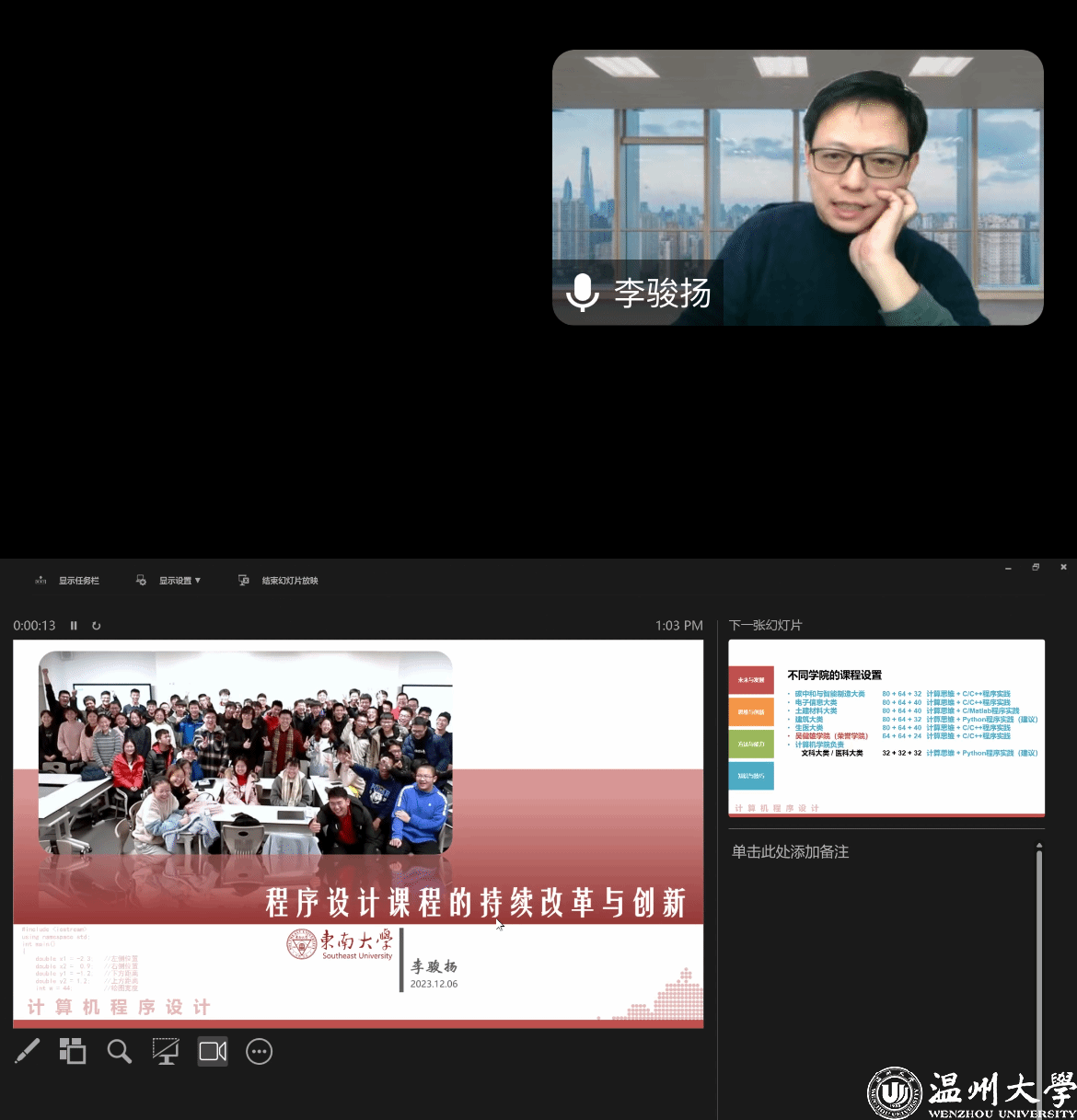 讲座伊始,黄辉副院长对李骏扬博士进行了详细介绍。随后,李骏扬博士在腾讯会议线上做《程序设计课程的持续改革和创新》专题报告,艳母 教师线下集中在5B206听讲座。李博士从教与学、课程架构、内容方法等方面分享了如何打造以学生为核心的“创新性、高阶性、挑战度”的创新课堂,强调教师设计课程活动时要注重带动学生积极思考,形成学生能够自主探索的挑战式课堂。李博士还通过分享自己的课堂教学实例,为参会教师展示了教学创新成果,并与参会教师进行了交流讨论。最后,黄辉副院长进行总结发言,他指出本次讲座内容丰富、案例生动、启发性强,希望与会教师能够结合实际,充分发挥教师的职业角色,不断激发学生自主思考潜力,进一步推进学院教学改革创新。