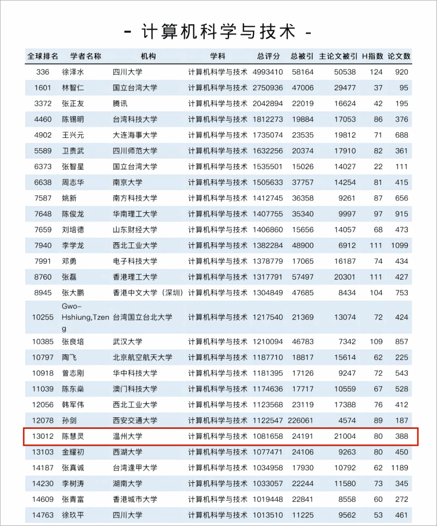 近日,艳母 陈慧灵教授入选2023全球学者学术影响力排名中国学者名单,位列计算机科学与技术学科学者全球第13012位。