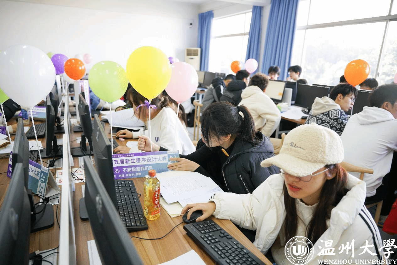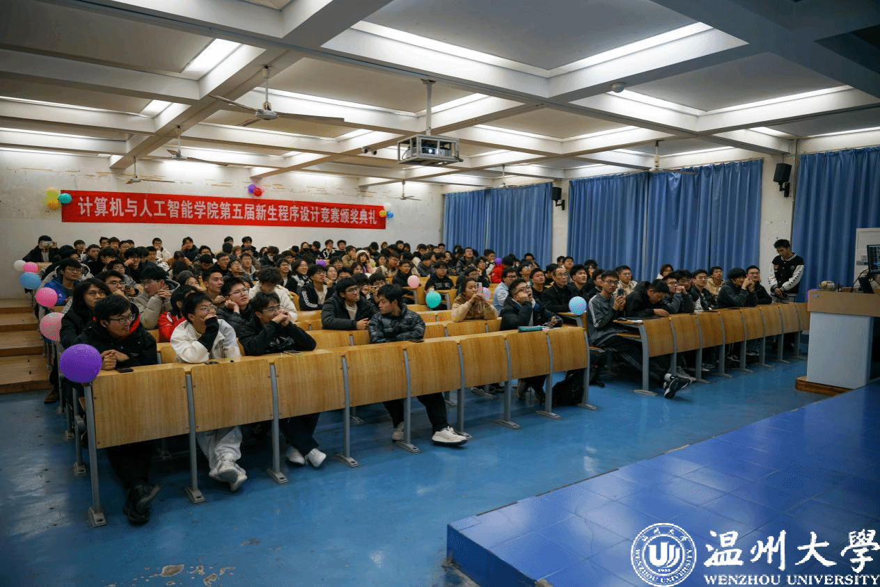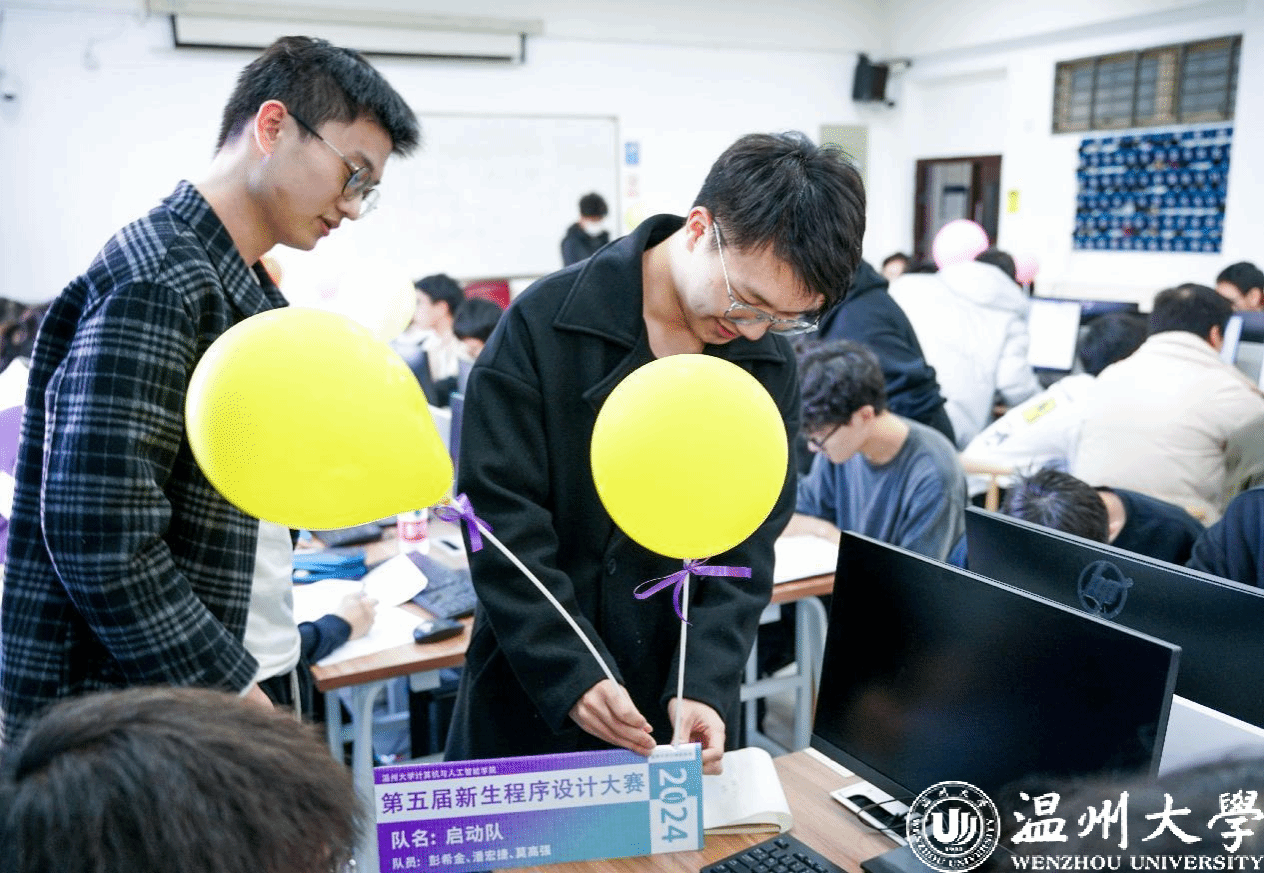 比赛现场战况焦灼,气氛热火朝天,参赛者认真思考,互帮互助,一双双神采奕奕的眼睛注视屏幕,键盘敲击声犹如打开计算机世界的大门。队员们于题海之中运筹帷幄,代码在屏幕上跃动,气球昭示着队友们的荣誉。首次通过一题的队伍由ACM老队员命题人亲自送上金色气球,这种首创做法更是吸引着大批人挑战还没有人通过的难题。经历了三个半小时的鏖战,共角逐出1支特等奖队伍,1支最佳女队,10支一等奖队伍,22支二等奖以及33支三等奖队伍。其中,由23生态莫皓翔、23大数据1班张宇濠和23人工2班毛烨超组成的“以下成绩全部无效”队荣获特等奖;由23电气1班金文清、23电气2班罗芷怡和23电气3班张涵组成的“萝萝山小分队”队获得“最佳女队”称号。获奖最多的是计算机专业:23计算机1班48人参赛,40人获奖;23计算机2班47人参赛,40人获奖,约占获奖队伍40%。