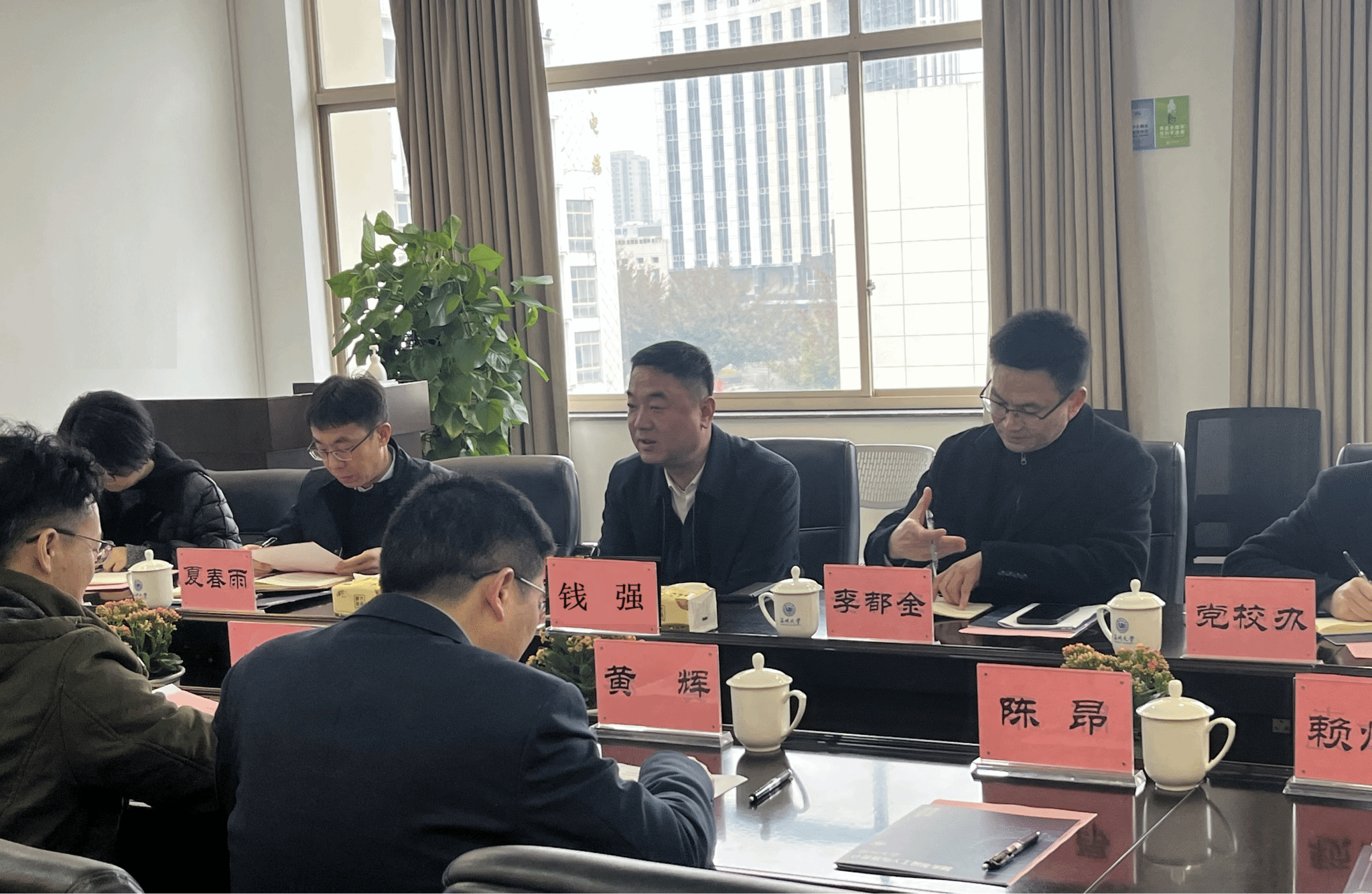 3月4日上午,校党委书记钱强,党委委员、纪委书记、省监委驻温大监察专员李都金,党委委员、组织部部长夏春雨一行莅临艳母 调研指导,党校办、教务处、研究生院、科技处、人事处等职能部门负责人陪同调研。学院全体领导班子及相关地方研究院负责人参加座谈会。