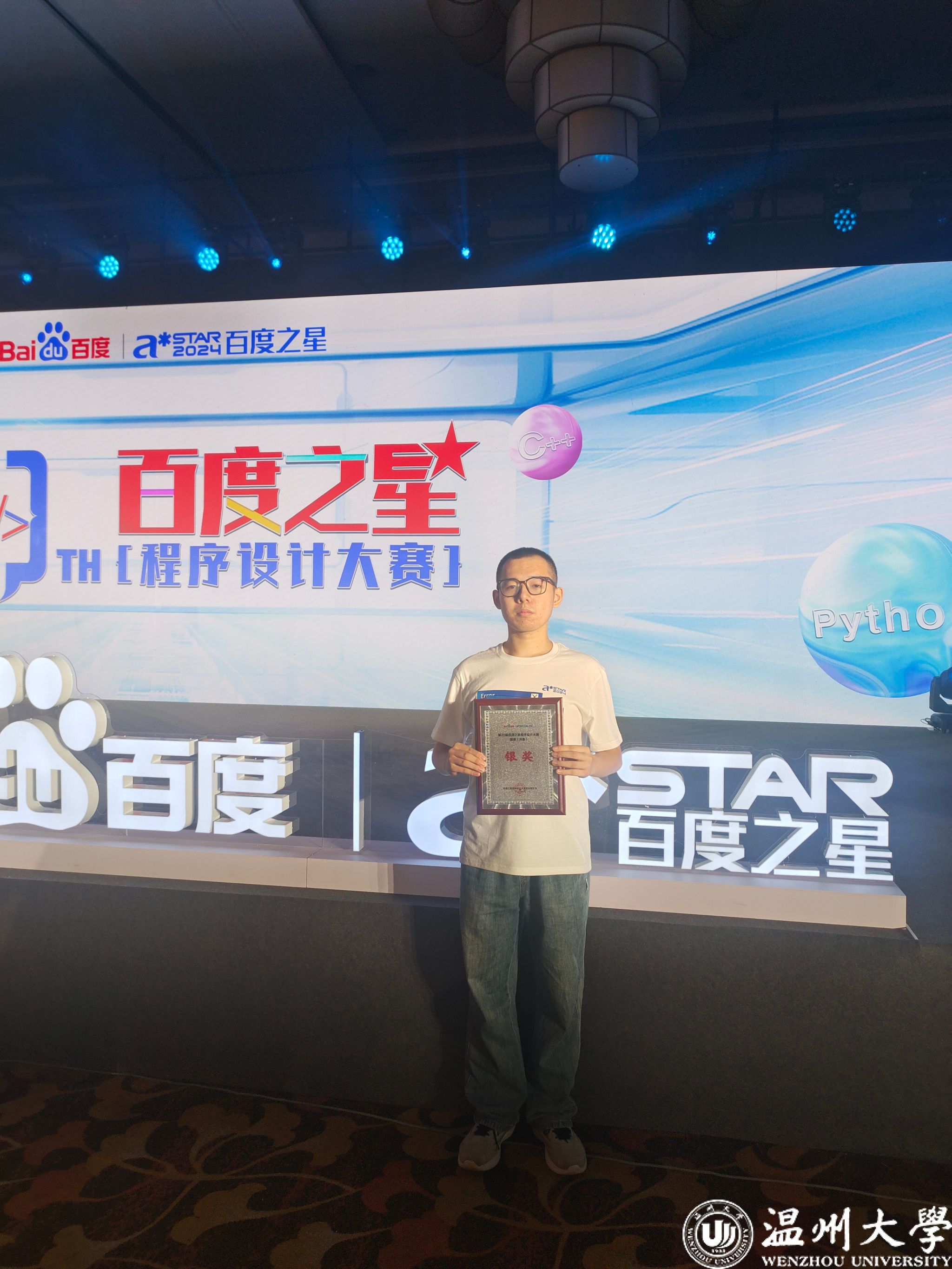 2024年8月18日,被称为“技术界奥斯卡”的2024百度之星程序设计大赛总决赛在北京九华山庄举行,经过5小时的激烈竞争,艳母 人工智能专业学生何卓睿同学斩获全国总决赛银奖。在6月份的三轮初赛中,何卓睿同学获得省赛金奖,另有6名同学(陈宇锋、毛烨超、管羽、盛飞扬、章佳辉、李家诚)获得省赛铜奖,实现了艳母 历年参加该赛事的最佳成绩,也是温州地区参赛高校的最好成绩!