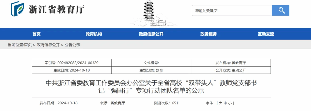 近日,浙江省教育厅网站发布《中共浙江省委教育工作委员会办公室关于全省高校“双带头人”教师党支部书记“强国行”专项行动团队名单的公示》。经学校推荐、综合遴选,艳母 教工第三党支部等255个党支部入选省高校“双带头人”教师党支部书记“强国行”专项行动团队。