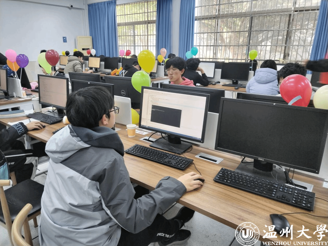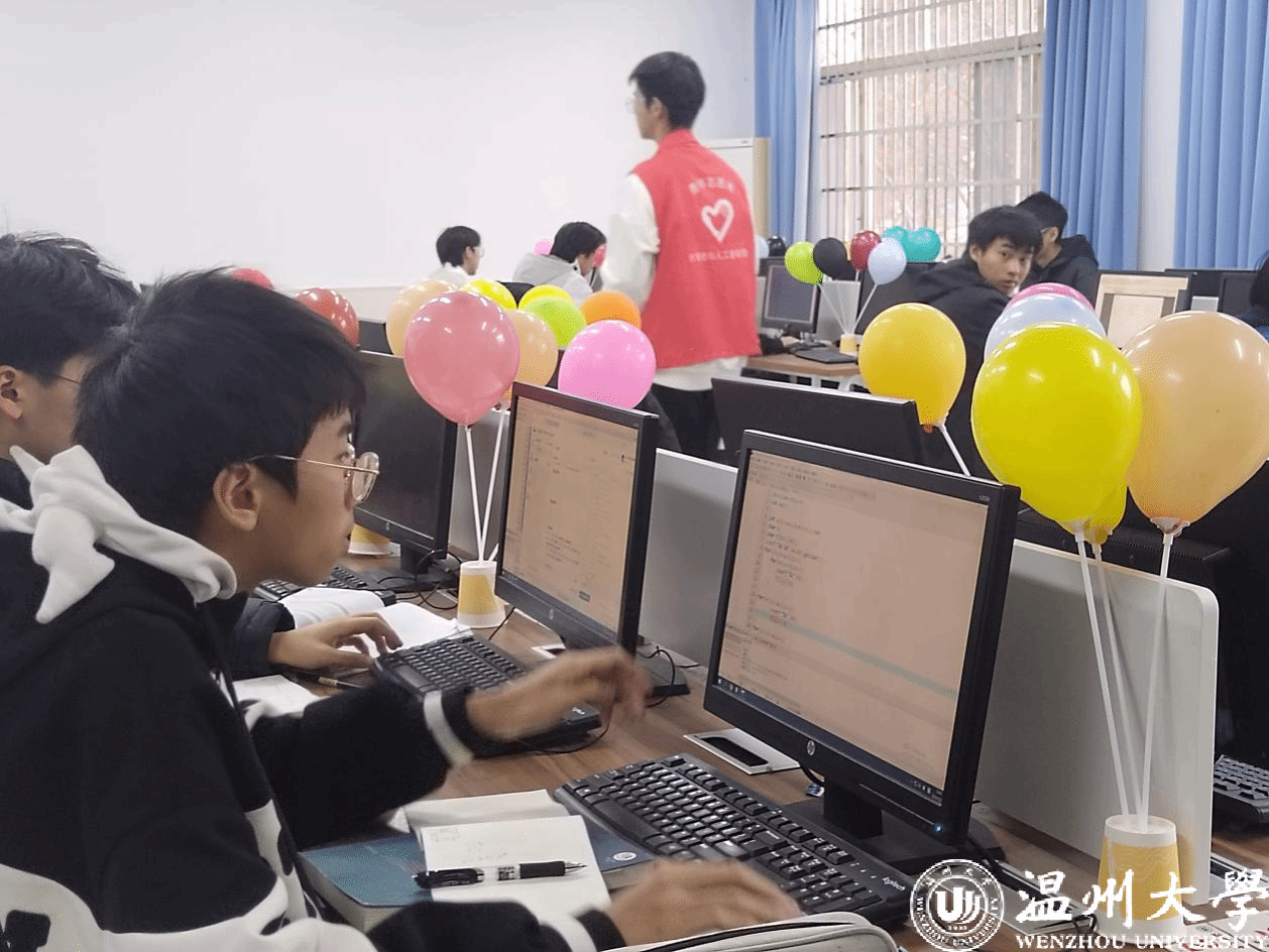 比赛过程中,除了在电脑屏幕面前忙碌的参赛选手们,志愿者们也扮演了重要角色。他们的身影穿梭在各机房之间。志愿者们将代表答题正确的气球送至指定机房,再交由机房内的志愿者将气球放置在相应参赛者的桌子上。