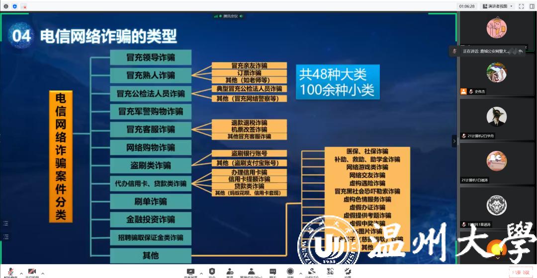 为增强艳母 学子安全防范意识,筑牢网络安全防线,提高反诈骗应对能力。2022年5月11日晚19点,艳母 于腾讯会议上举行了2022年校友思享会——揭下网络黑灰产“画皮”与“套路”,力保“触网”安全。本次思享会由学院辅导员叶桦畅老师主持,并有幸邀请到十佳爱民警察、温州市公安局鹿城区公安分局网警大队包长昕警官与艳母 300余名学生漫谈安全用网。
