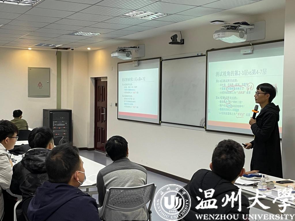 11月22日上午,网络工程系副主任、2020年校教师课堂教学竞赛一等奖获得者金可仲在5B206执教《网络测试与分析》明心示范课。来自计算机学院、建工学院等12名教师一起观摩了示范课。《网络测试与分析》课程是网络工程专业的核心课,以工程师视角的测试设计与分析能力培养为目标,通过产学深度合作共建课程资源,以问题与案例驱动模式实施教学,提升学生综合运用专业知识和测试理论方法解决复杂工程问题能力。本次授课内容是“网络4-7层测试”部分的第一节课,金可仲老师和学生一起简要回顾了之前所学的“2-3层测试”的内容,并通过“奥运会门票在线预订系统”、“双11电商购物平台”这两个真实的案例引出面向“服务质量”、“用户体验”的网络4-7层测试需求场景,进入本单元的教学内容。