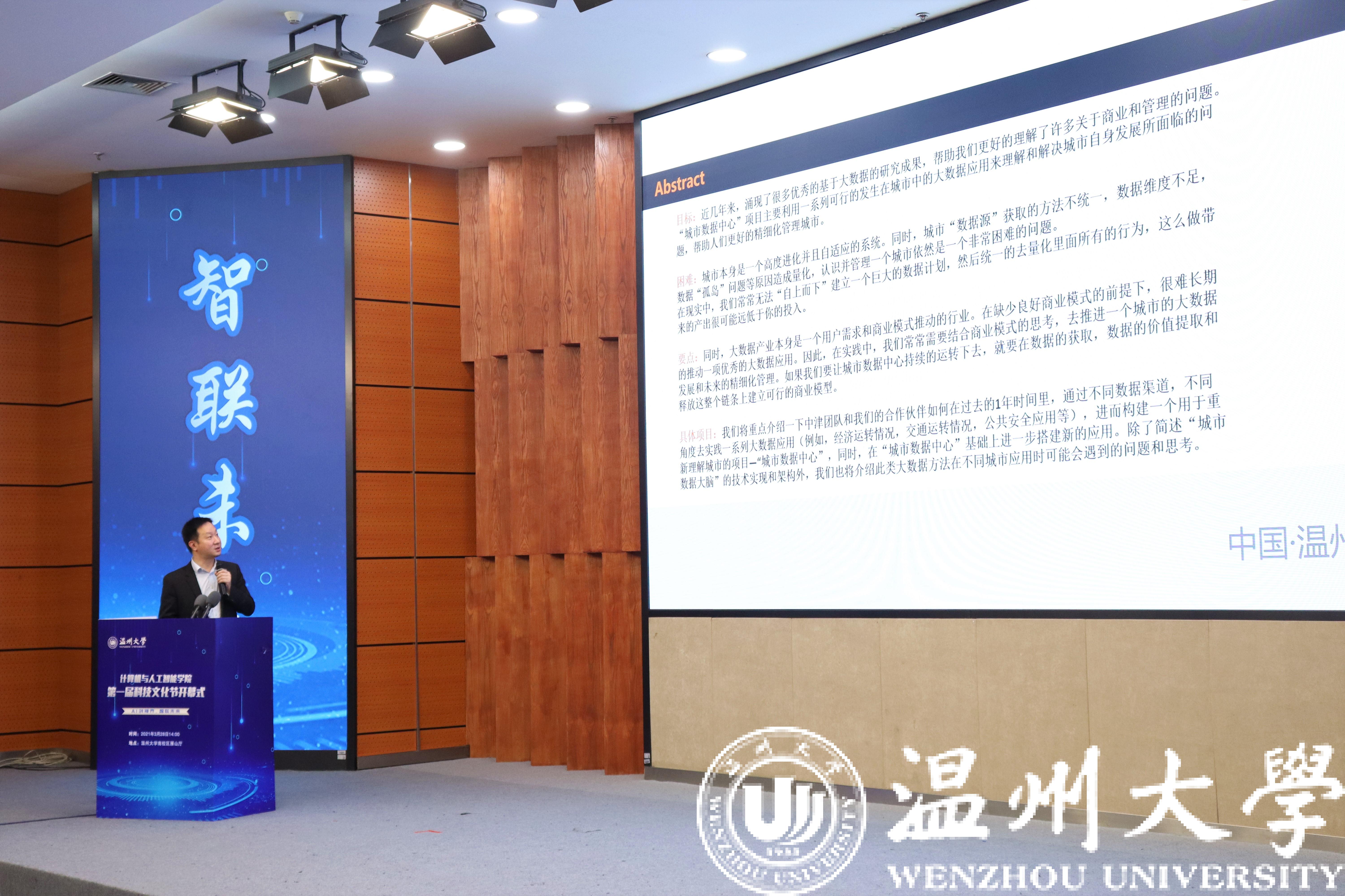 紧接着,温州中津先进科技研究院王振宇院长做《人工智能与大数据应用》的专题讲座。在讲座中,王院长主要讲解了“一个基于大数据方法的城市精细化管理计划的探讨”,并以“中国电子商务大数据统计监测体系”、“区域教育大数据项目”、“城市出租车大数据项目”等项目为例,为同学们讲解了人工智能与大数据技术在不同领域的应用和未来发展方向。进入互动环节,王院长耐心生动地解答了同学们提出的问题,为同学们在人工智能和大数据的探索求知之旅上指明了前进的方向。至此,本次科技文化节开幕式圆满结束。