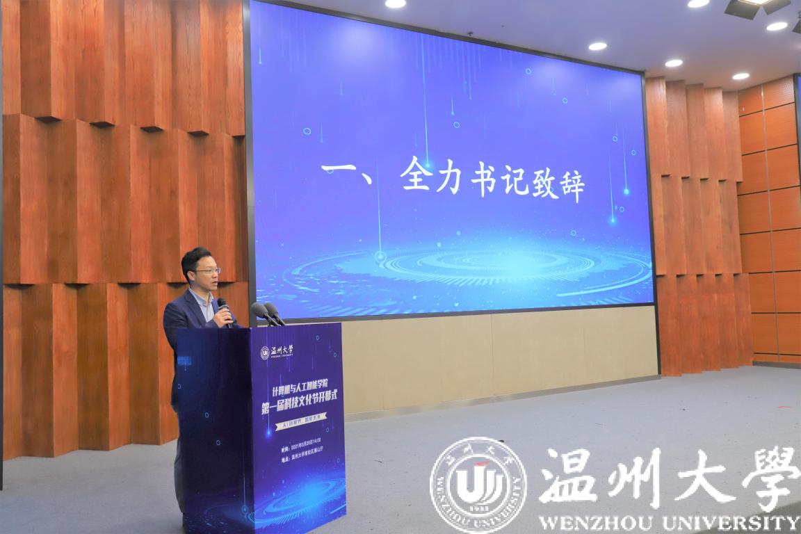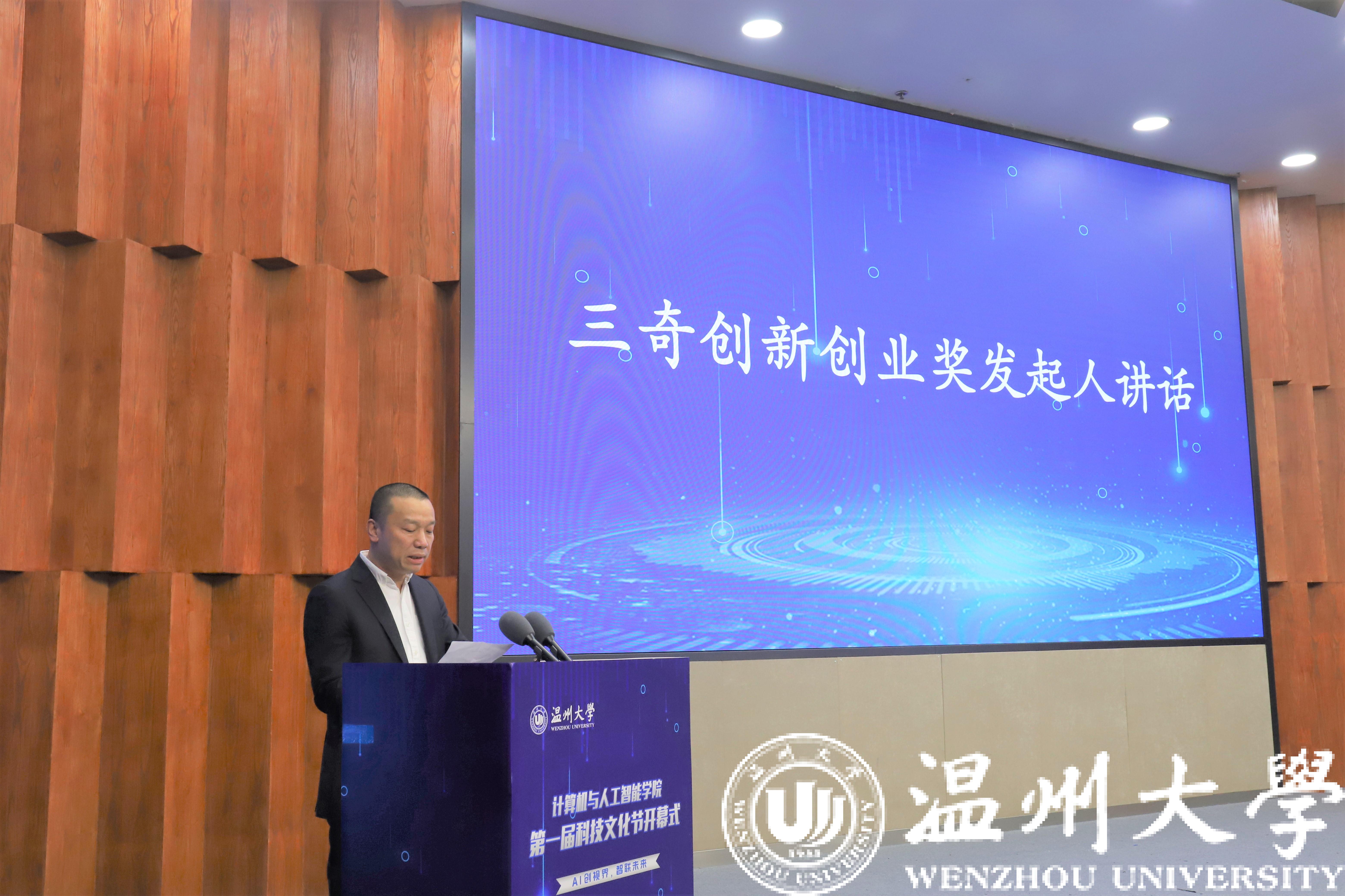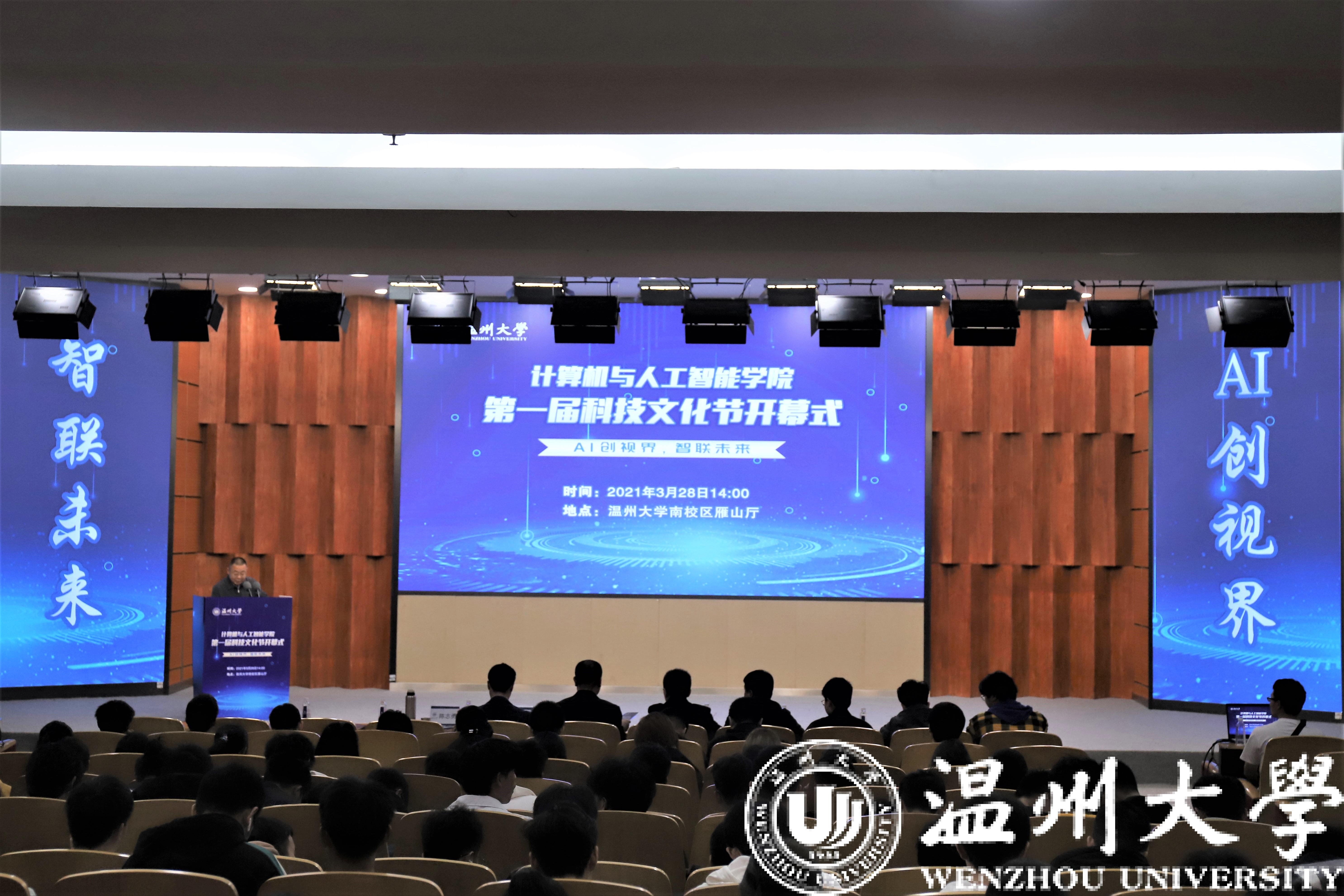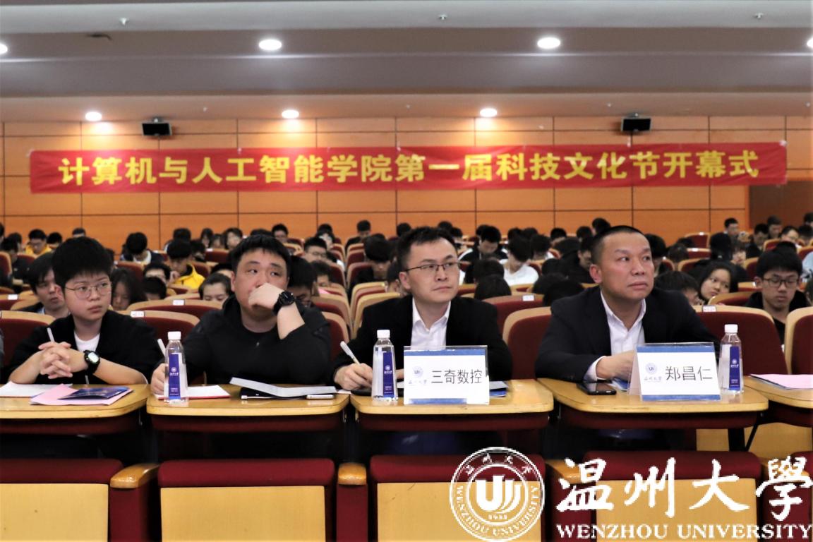 3月28日14时,艳母 “AI创视界,智联未来”第一届科技文化节开幕式在岩松堂雁山厅隆重举行。出席本次开幕式的嘉宾有浙江三奇机械设备有限公司总经理郑昌仁先生,温州市中津先进科技研究院王振宇院长,学院党委书记全力老师,三奇公司技术人员代表、学工办全体辅导员老师以及AI创空间入驻团队负责人们。开幕式由学院党委副书记陈志勇老师主持。