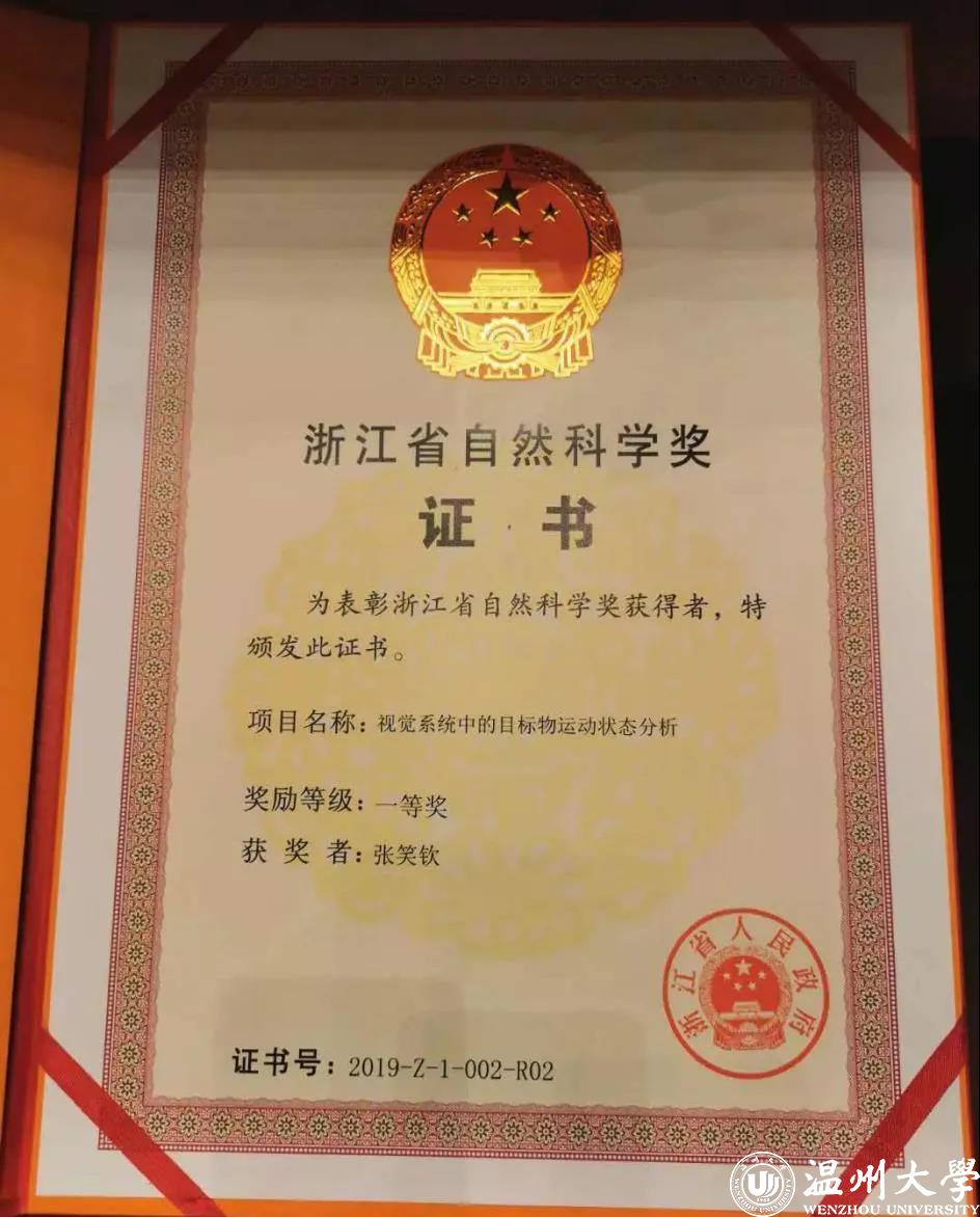 艳母 张笑钦院长所参与的《视觉系统中的目标物运动状态分析》获得浙江省科学技术奖自然奖一等奖。