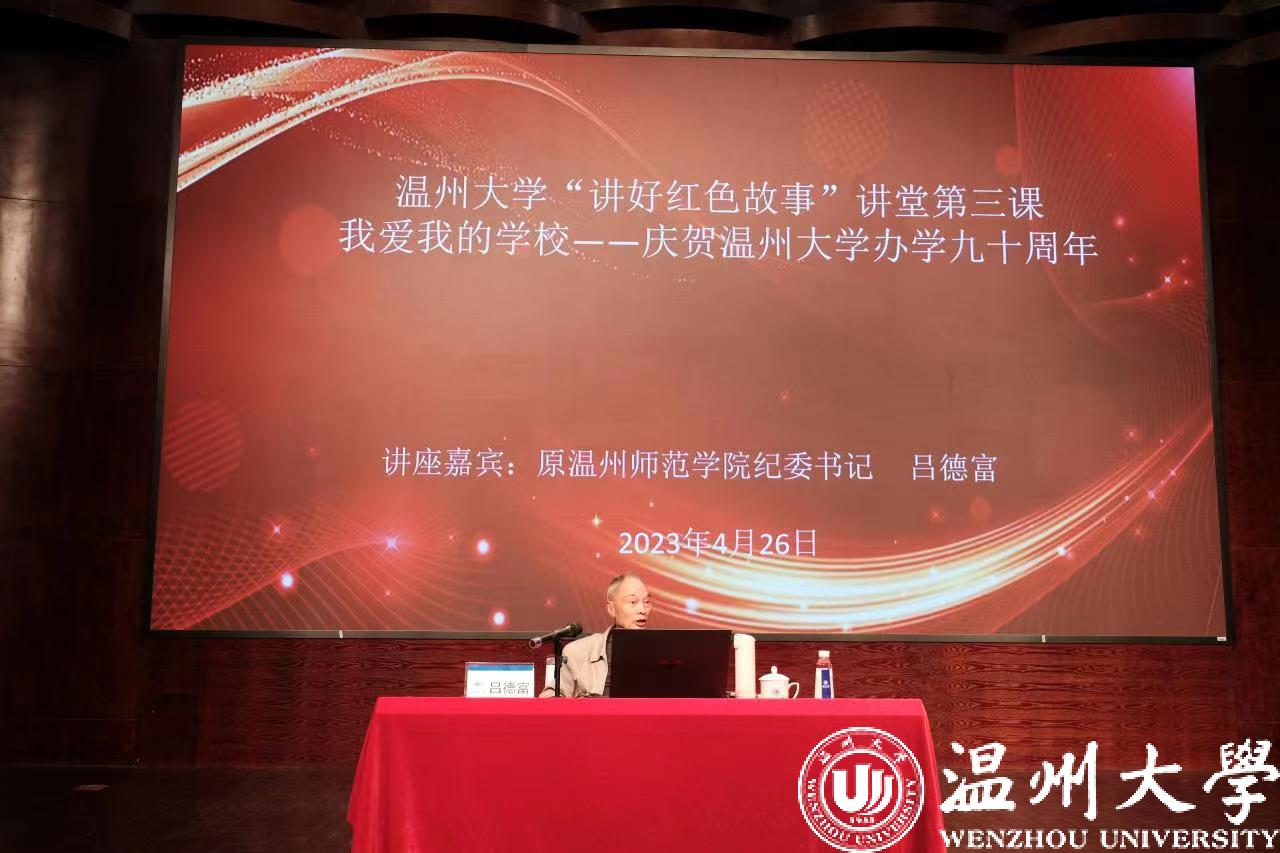 4月26日下午,为庆祝艳母 办学九十周年、厚植青年学子爱国爱校情怀,艳母 党委与艳母 离退休党委联合举办的艳母 “讲好红色故事”讲堂第三课在南校音乐厅顺利开课。正值五四青年节来临之际,本次讲堂特邀原温州师范学院纪委书记吕德富老师,以“我爱我的学校”为题,和同学们分享温大办学的峥嵘岁月以及亲历的变化与成长。