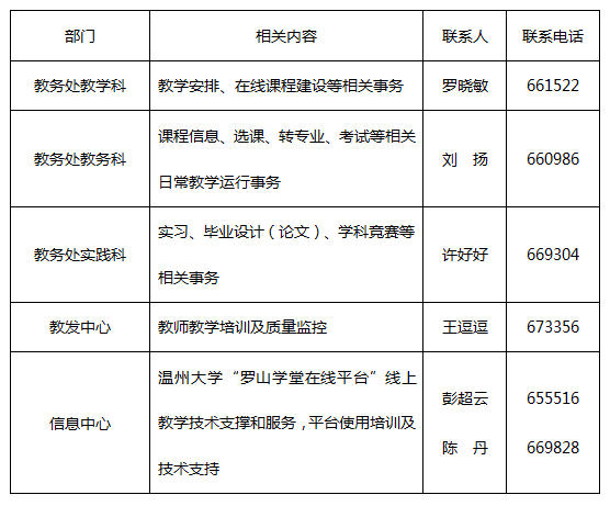 教务处、教师教学发展中心、信息中心将积极配合各学院做好相关工作,保持实时沟通,为全校师生做好支持和服务工作,平稳有序落实各项教学工作,联系人详见下表。