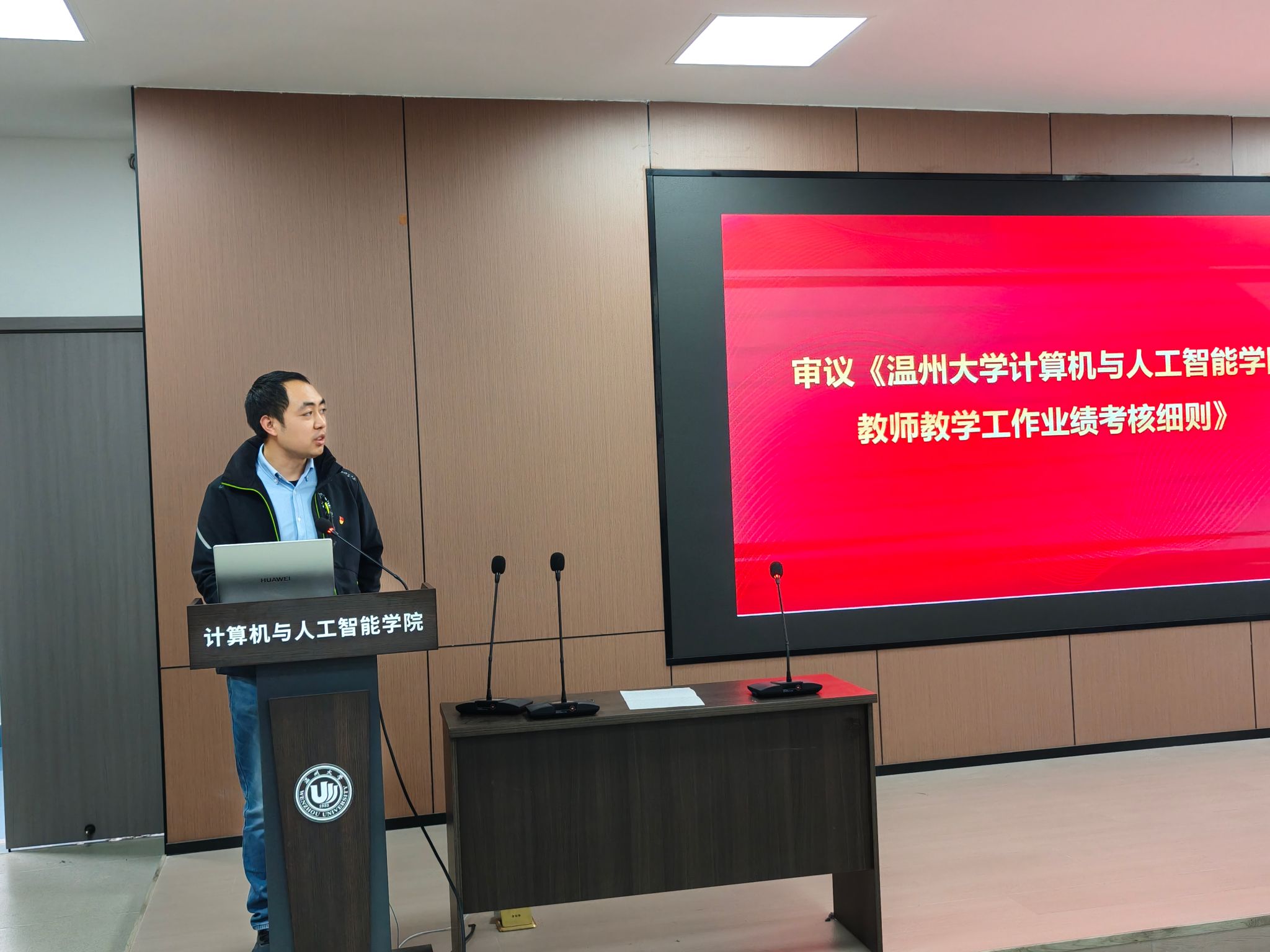 黄辉副院长聚焦科研与地方服务工作进行汇报。他通报了学院在国家自然科学基金、省自然科学基金等科研项目立项中取得的丰硕成果,这一成绩体现了学院科研水平的持续提升。紧接着,他重点解读了《温州市加快建设人工智能创新发展先行市的实施方案(2025—2027年)》文件精神,指出该方案为学院发展提供了重大机遇和清晰指引,激励教师们紧密结合地方产业发展需求,深入开展科研攻关,助力区域人工智能创新生态建设。此外,他还传达了学校《关于开展学院货物和服务采购项目检查工作的通知》要求,强调务必规范采购流程,确保各项采购活动合规、高效。
