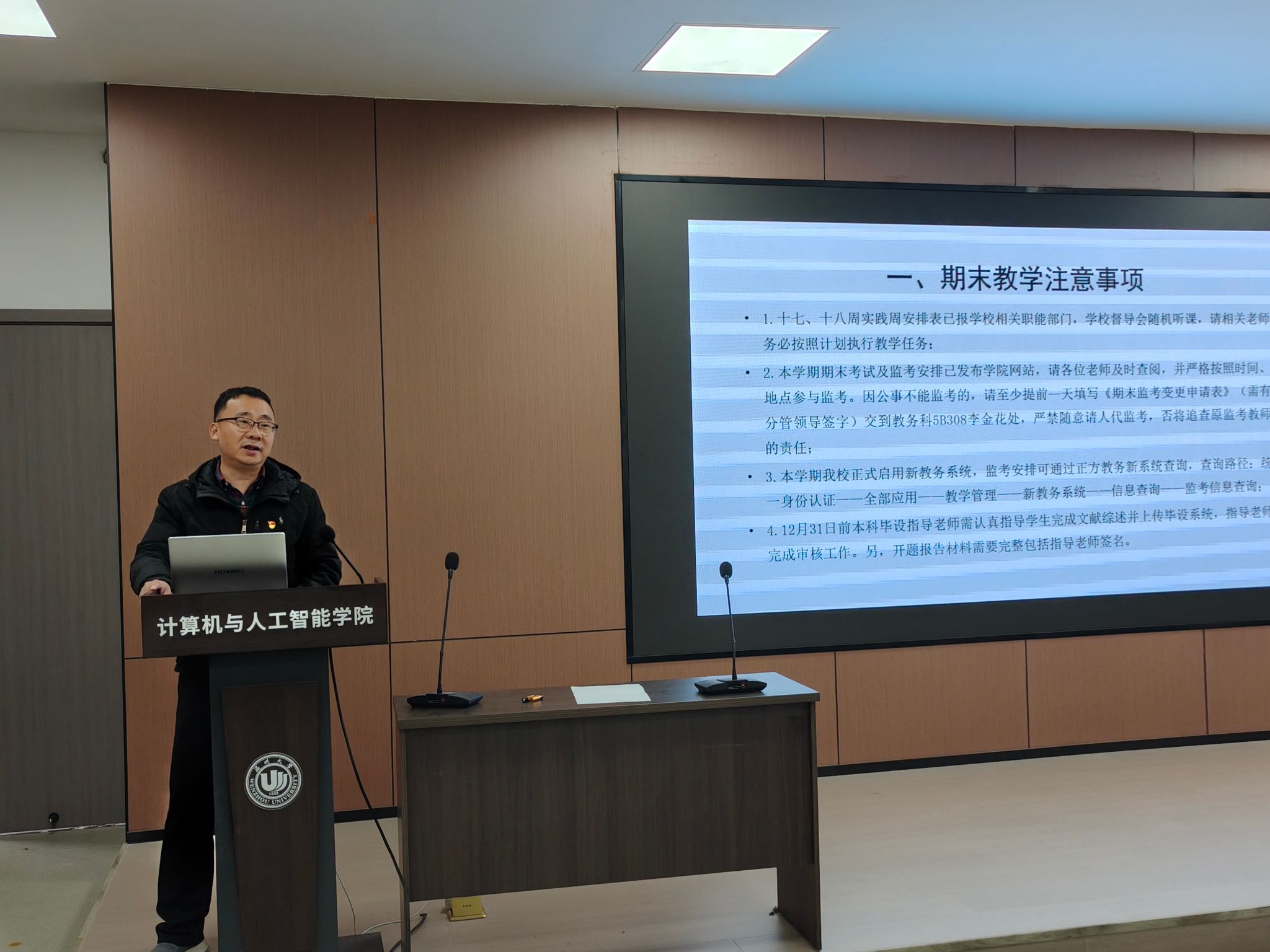 针对学期末的教学收尾工作,胡众义副院长进行了周密部署。他就期末试卷批改的规范性、成绩录入的准确性与时效性、成绩材料及课程档案的整理与上交等关键环节,作了详尽细致的说明与安排,要求全体任课教师严守教学纪律,确保本学期各项教学工作圆满收官。