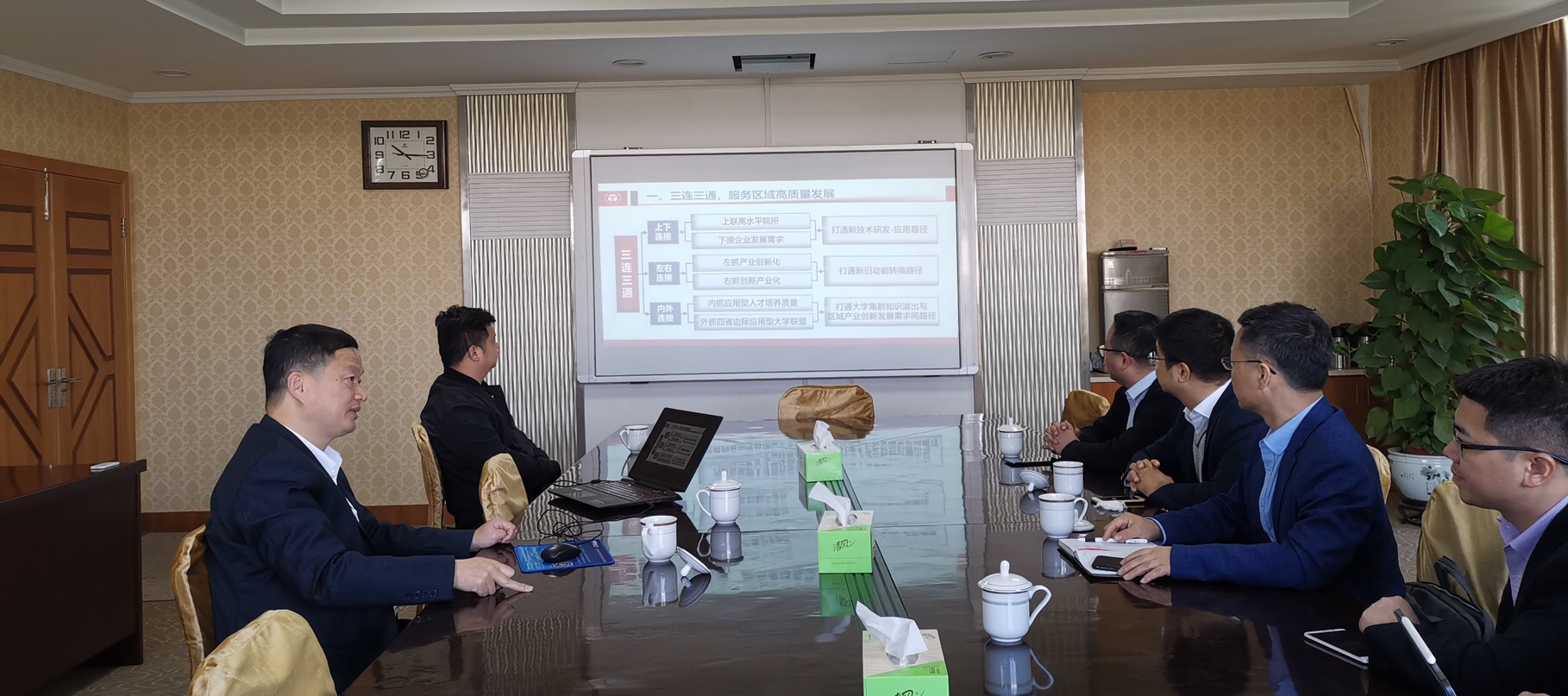 参观结束后,双方就产教融合等主题进行了座谈交流。首先,谢志远校长从做足“三连三通”,精准服务地方发展、做好“两转两化”,促进学校高水平建设、做到“一心一意”,打造产教融合发展共同体三大方面介绍了高校如何在服务区域高质量发展中实现自身发展。随后,全力书记从艳母