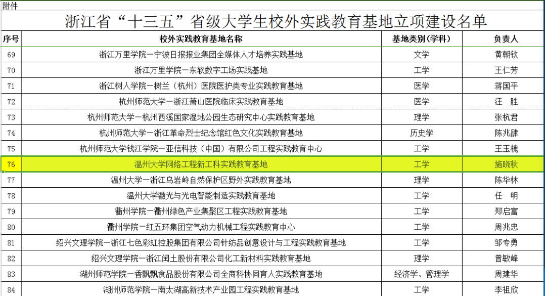近日,浙江省教育厅办公室公布了119个“十三五”省级大学生校外实践教育基地立项建设名单,艳母 施晓秋教授申报的“艳母 网络工程新工科实践教育基地”获批。其中部分大学生校外实践教育基地名单如下: