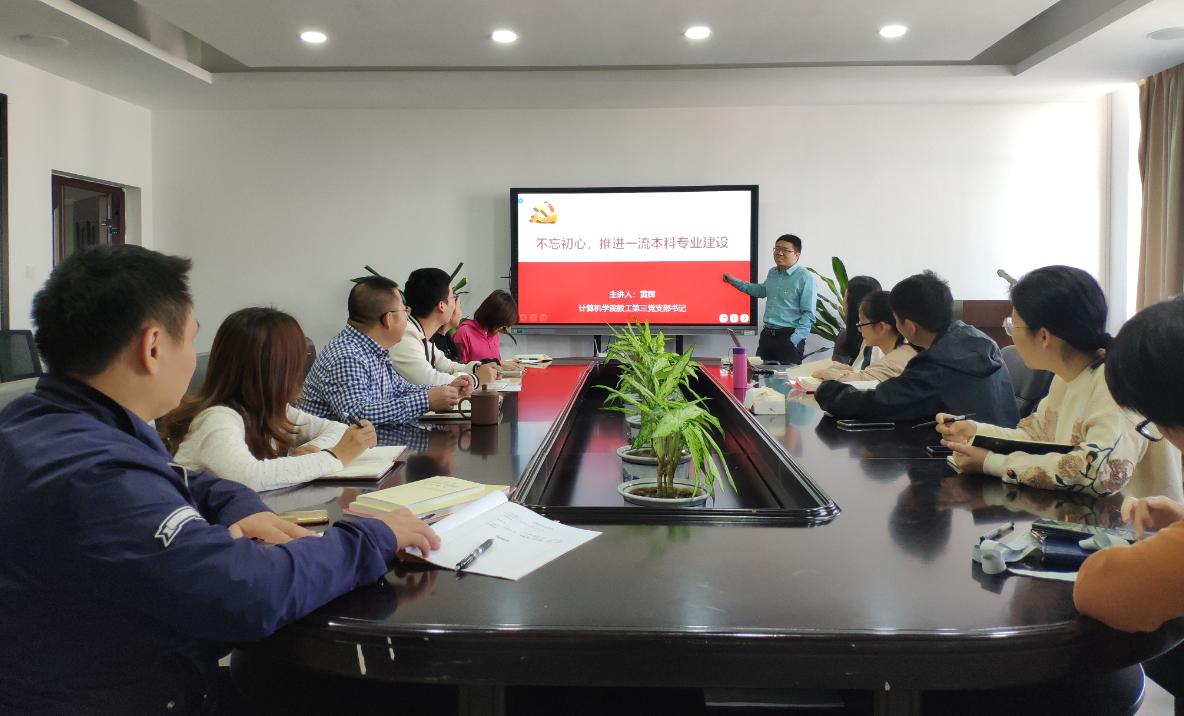 为深入开展“不忘初心、牢记使命”主题教育,10月30日上午9:00,在南5B-318会议室,艳母 副院长、教工第三支部书记黄辉为支部全体党员上“不忘初心,推进一流本科专业建设”为题的专题党课。