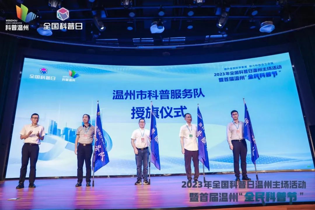 现场还举行了科普服务队授旗仪式,艳母 、国科温州研究院、正泰集团股份有限公司、温州市海外科技工作者协会他们将发挥各自科普资源优势,面向中小学、社区、机关单位等积极开展丰富的科普活动。