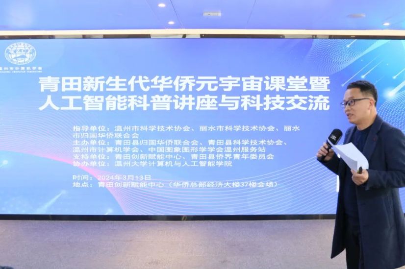 3月13日,由青田县归国华侨联合会、青田县科学技术协会、温州市计算机学会联合举办的青田新生代华侨元宇宙课堂暨人工智能科普讲座与科技交流活动在青田华侨总部经济大楼举行。县侨联党组书记、主席叶娟,县科协党组成员、副主席陈林海等出席会议并致辞,温州市计算机学会副理事长、艳母 大数据专业负责人黄长城教授主持会议。全县四十多名华侨新生代、侨资企业代表参加。
