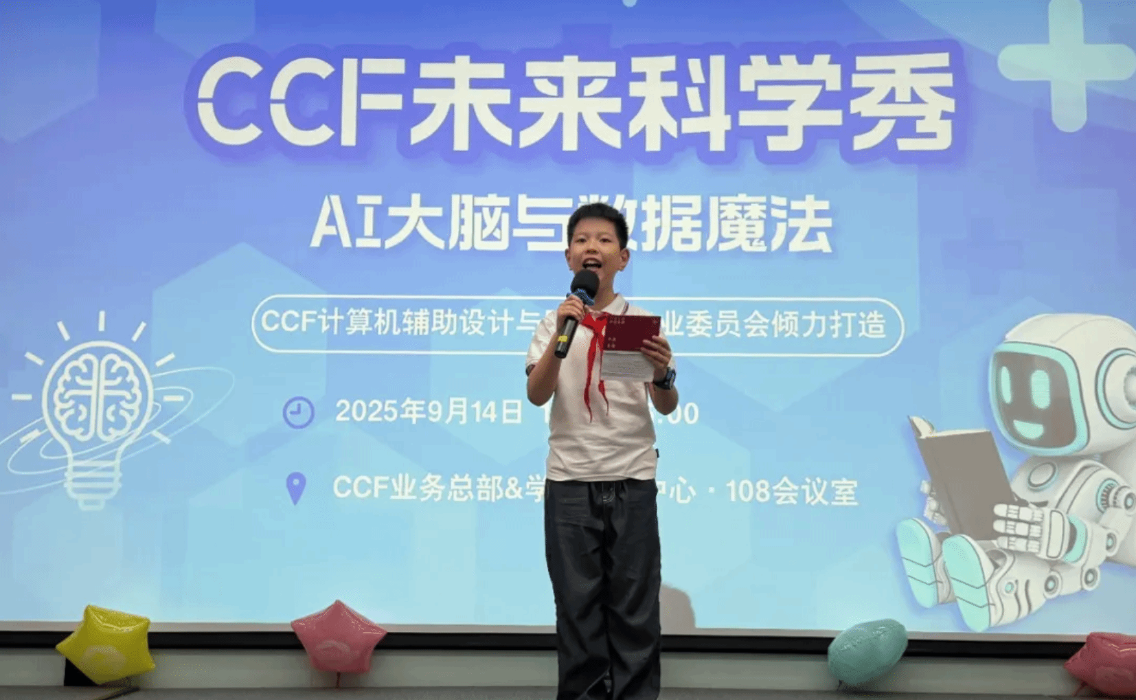 本场活动的点睛之笔:CCF未来科学秀为青少年朋友们提供锻炼和展示自己的舞台。经过层层选拔,我们小小志愿者招募活动得到了突破,来自中科大附中独墅湖学校的潘子尧同学担任了本期未来科学秀的小主持人。他以清晰流畅的表达,从容把控现场节奏,流畅串联各个环节,展现出沉稳大气的台风,赢得了众多家长与老师的充分肯定。现场观众纷纷举起手机,记录下这一科普教育与素质能力提升的精彩时刻。