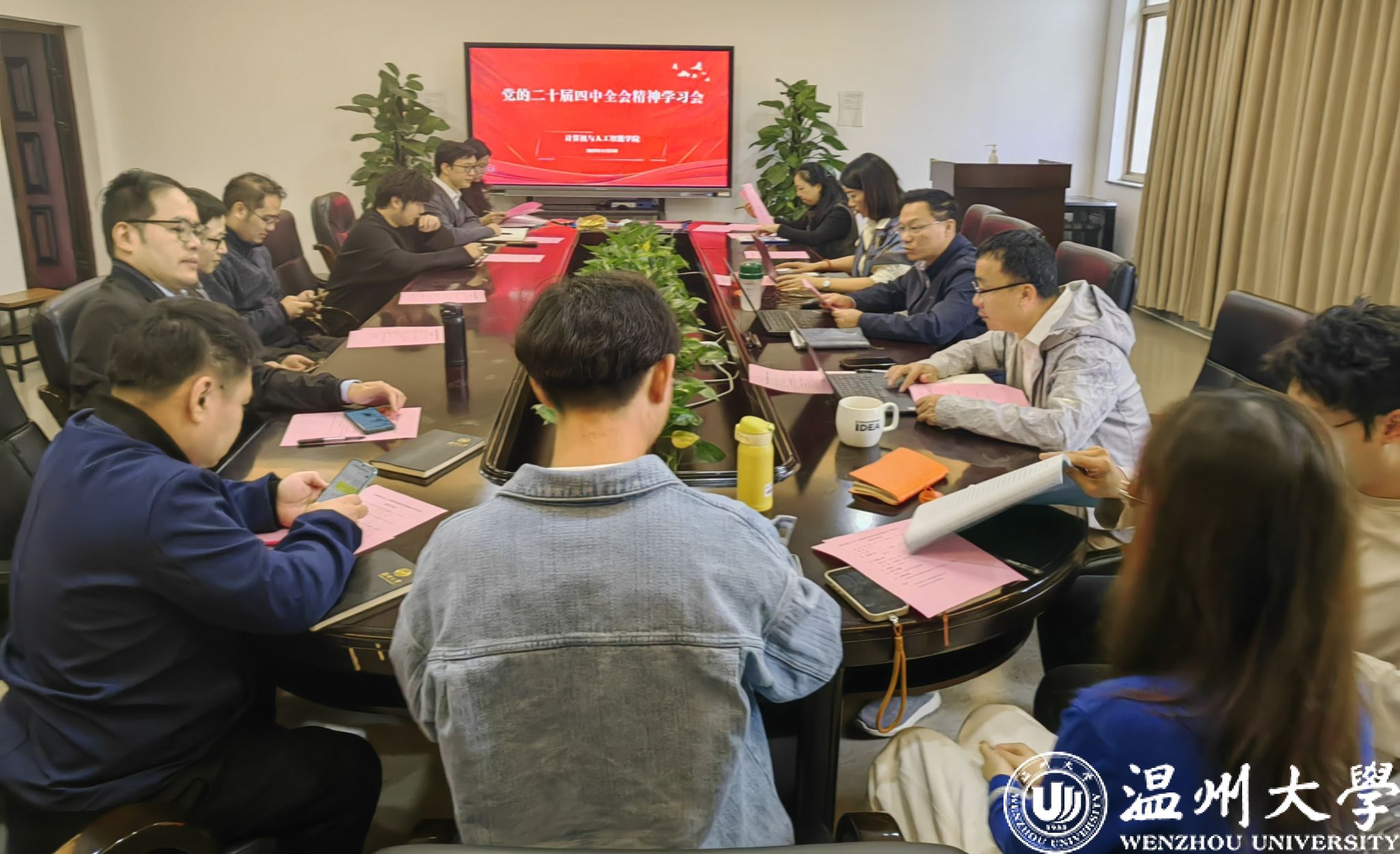 11月3日,温州大学计算机学院召开党的二十届四中全会精神理论学习中心组学习会。学院领导班子成员、党委委员、各党支部书记参加会议,学院党委书记主持会议并作总结讲话。