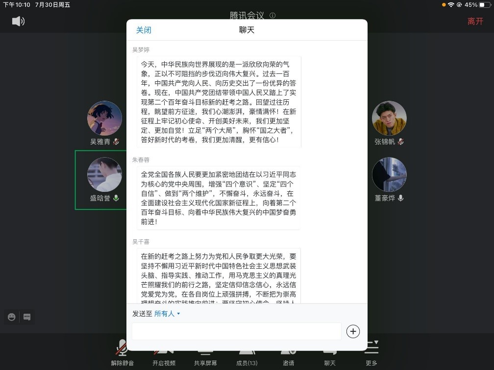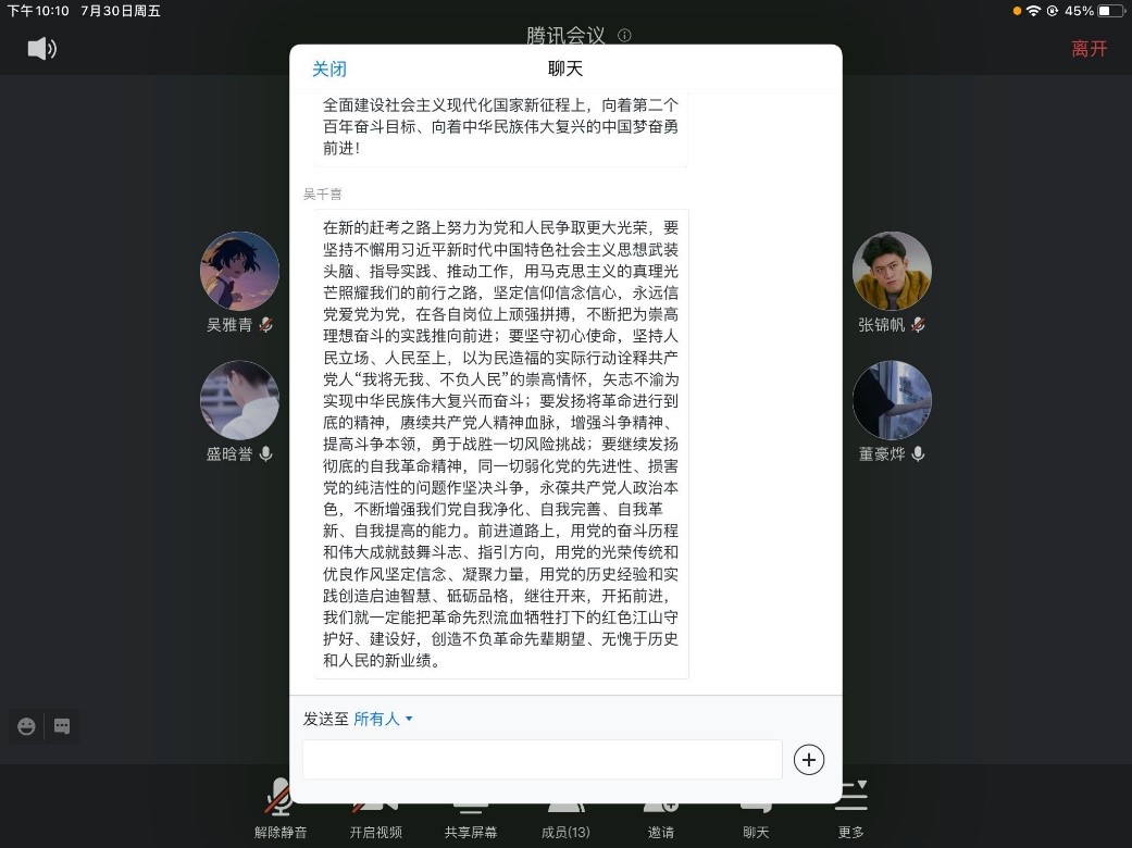 2021年7月1日,我们迎来了建党100周年华诞,习近平总书记在庆祝中国共产党成立100周年大会上发表了重要讲话,向世界宣示了坚持和发展中国特色社会主义的坚定决心。2021年7月30日晚,艳母 本科生第一党支部召开了由吴梦婷同学主持的学习会,学习习近平总书记此次重要讲话,共有4名正式党员和10名预备党员到会。
