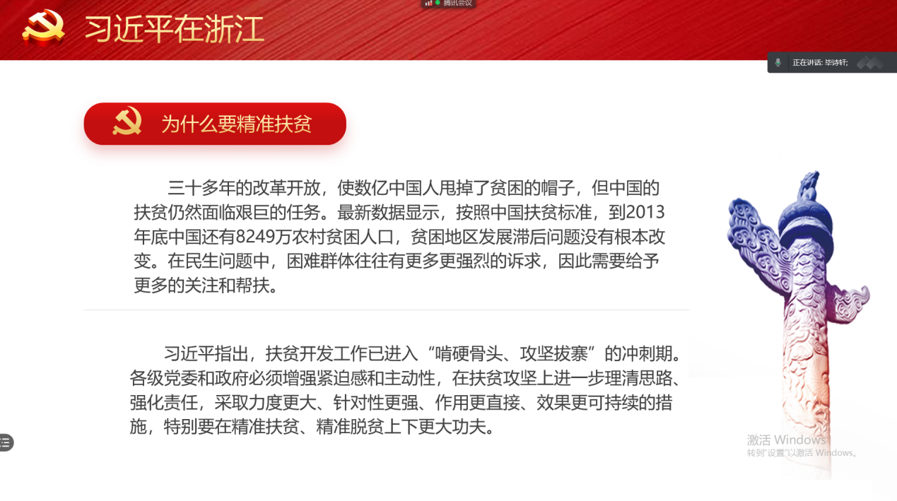 第二环节,毕诗轩同志带领大家共同学习了《习近平在浙江》的重要思想,对“绿水青山就是金山银山”、“精准扶贫”等概念进行了讲解,号召同志们认真学习领会,形成思想力量和精神力量,完成时代赋予我们这代人的重任。
