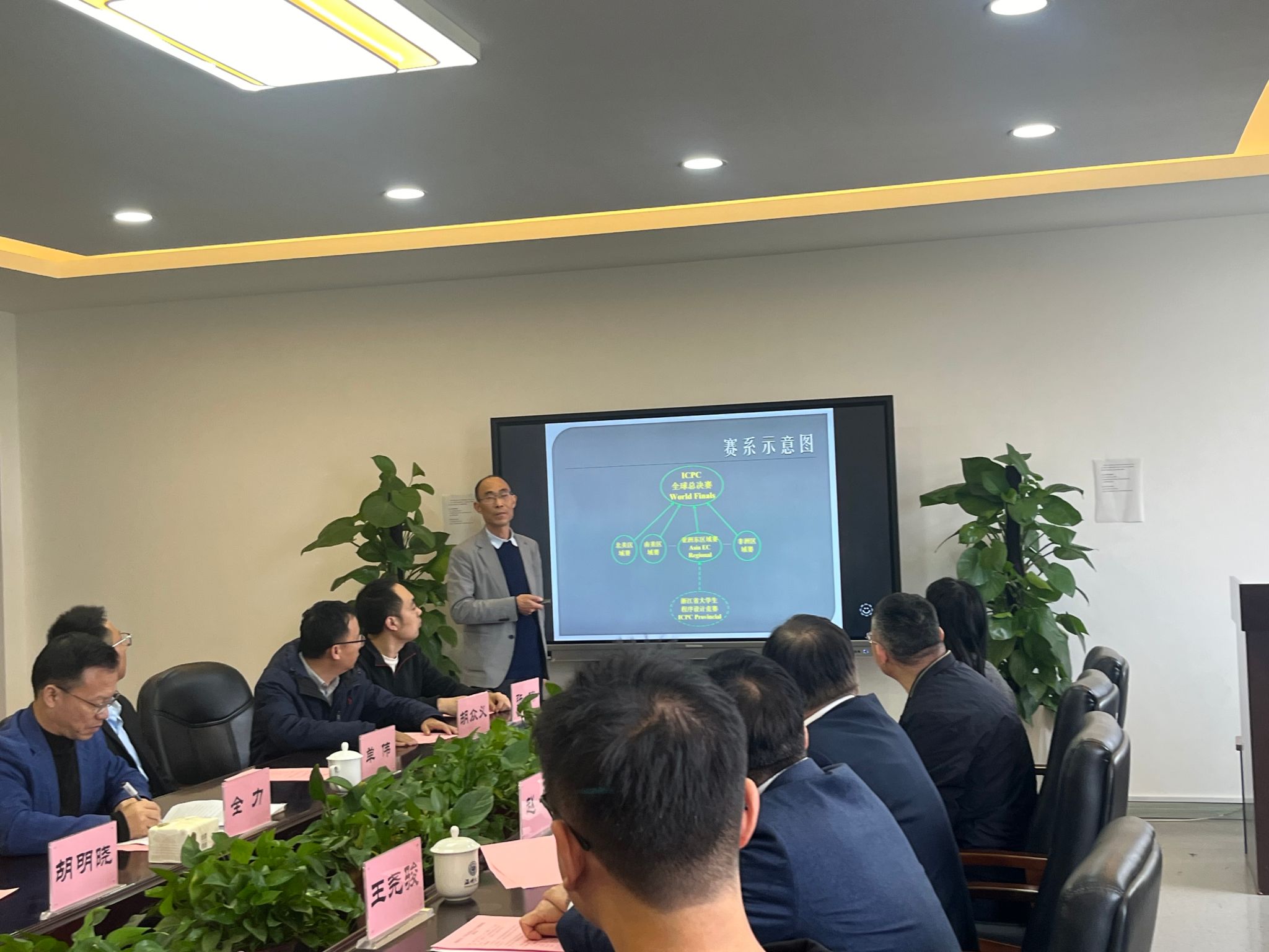 座谈会伊始,学院ICPC竞赛主教练胡明晓老师就赛事概况、团队建设、训练体系及参赛历程作了系统汇报。随后,全力书记代表学院,围绕ICPC及相关高水平学科竞赛的组织保障、资源支持与育人成效等方面进行整体介绍,重点阐述了学院以竞赛为抓手推动人才培养、教学改革与产学研协同的创新实践。