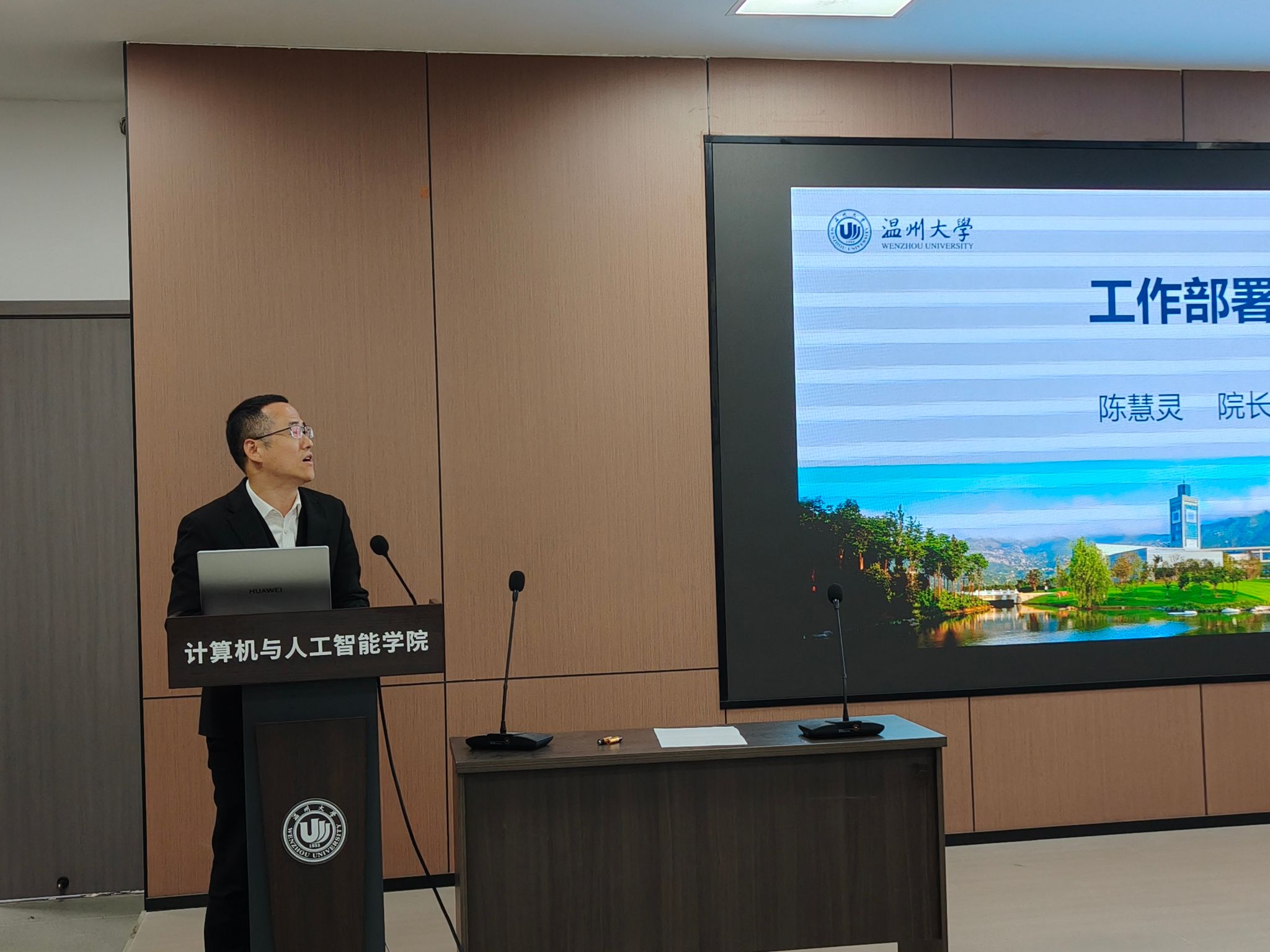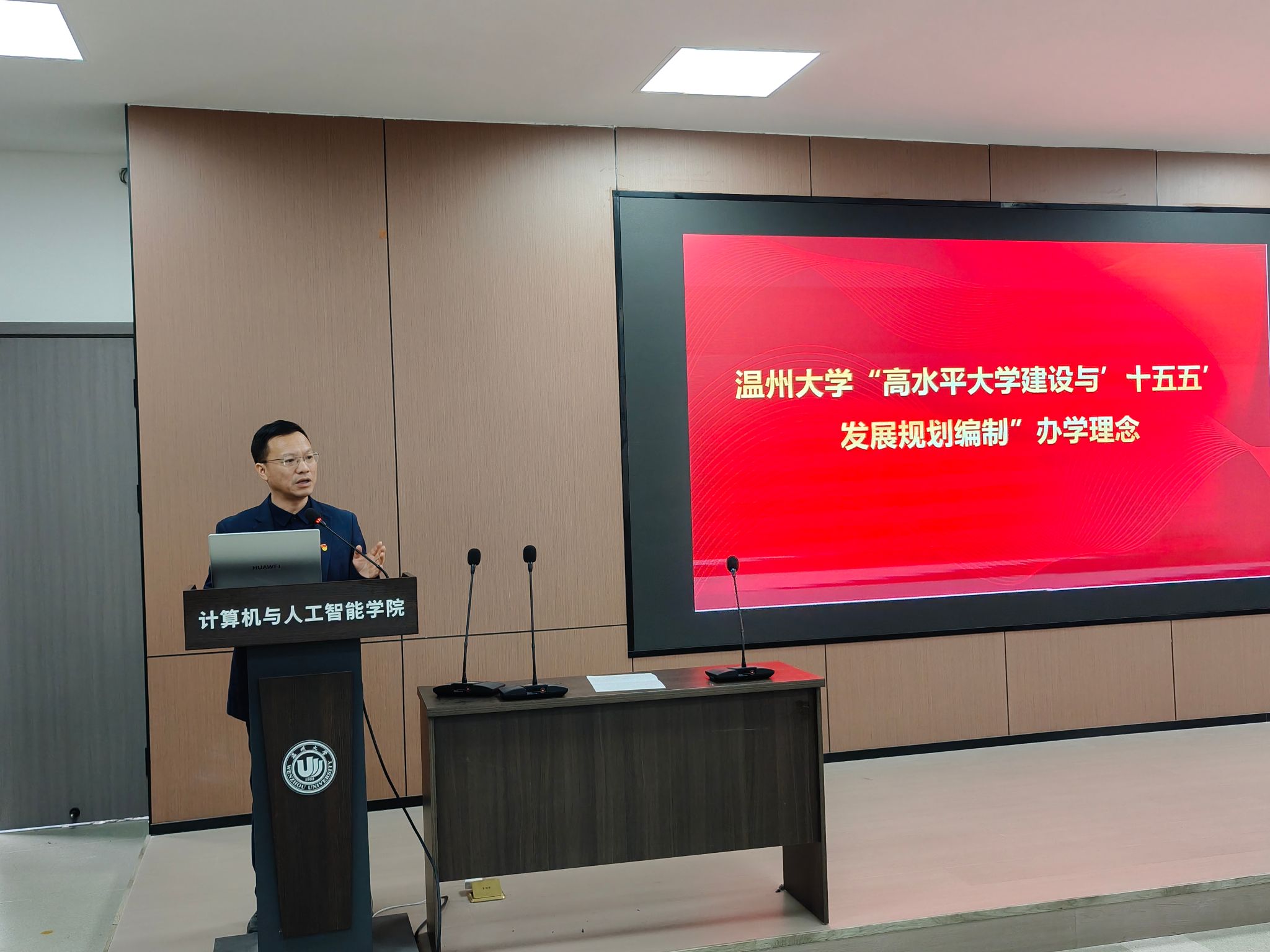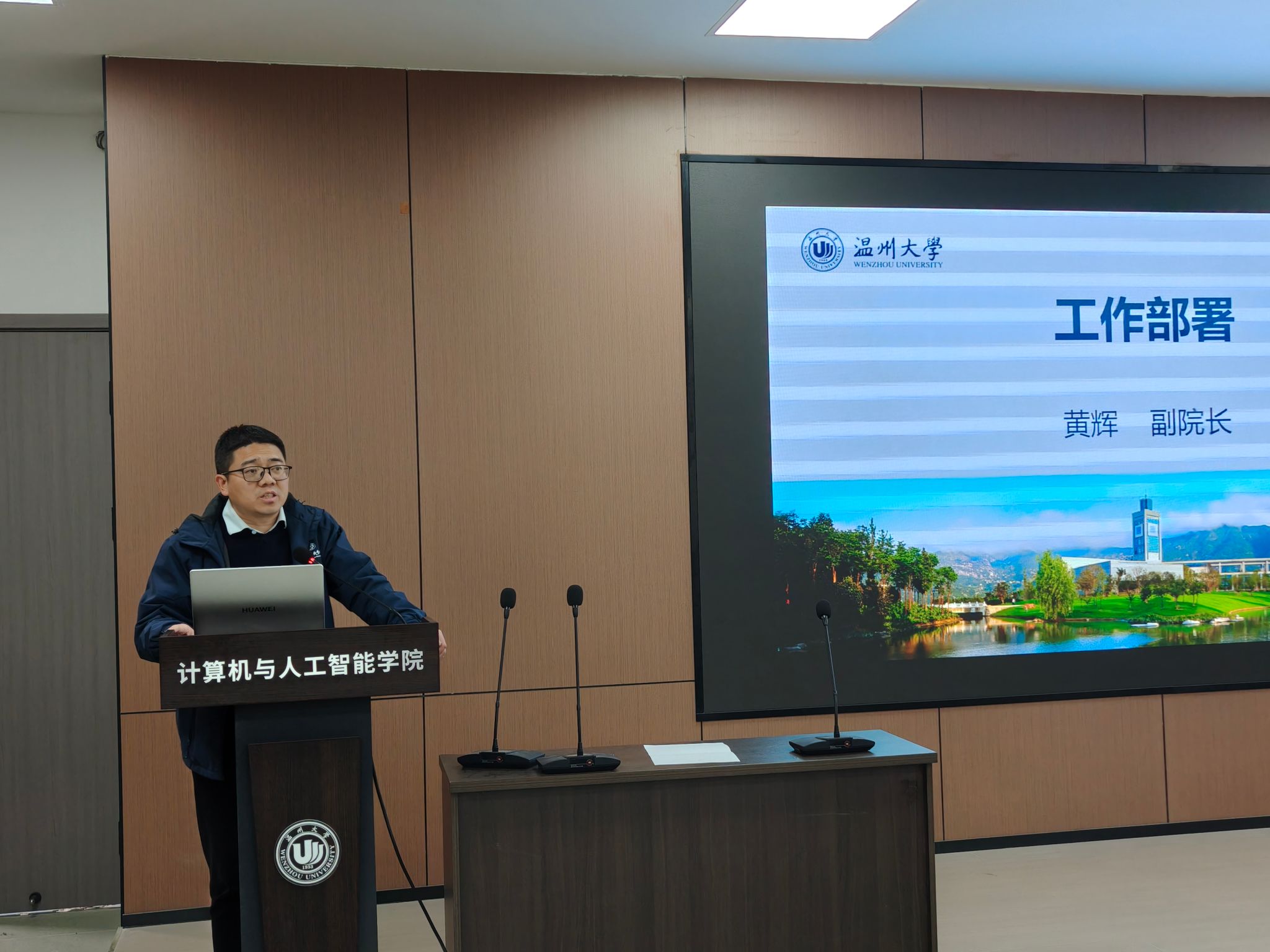 黄辉副院长聚焦科研与地方服务工作进行汇报。他通报了学院在国家自然科学基金、省自然科学基金等科研项目立项中取得的丰硕成果,这一成绩体现了学院科研水平的持续提升。紧接着,他重点解读了《温州市加快建设人工智能创新发展先行市的实施方案(2025—2027年)》文件精神,指出该方案为学院发展提供了重大机遇和清晰指引,激励教师们紧密结合地方产业发展需求,深入开展科研攻关,助力区域人工智能创新生态建设。此外,他还传达了学校《关于开展学院货物和服务采购项目检查工作的通知》要求,强调务必规范采购流程,确保各项采购活动合规、高效。