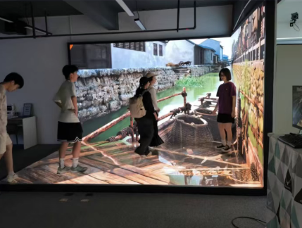 在研究院内,一系列前沿科技成果让实践队员们沉浸式感受科技力量。在人工智能对弈区,指导老师介绍,这里的五子棋机器人实力强劲,即便顶级选手也难取胜,其原理与阿尔法狗相近,存储海量棋局,相较人类最多记忆20种棋路的极限,能掌握成百上千种棋路,象棋对弈时更可分析胜率并语音解读棋路,让队员们在对弈中直观感受AI强大的决策能力。VR沉浸式体验房则通过多感官模拟技术打造逼真虚拟环境,队员们触摸墙面的生肖古文字时,文字即刻转化为活灵活现的生肖形象,瞬间开启奇幻的虚拟探索之旅。此外,研究院借助3D建模技术还原的宋代温州虚拟场景,古色古香的建筑、车水马龙的街道与身着传统服饰的人物,让千年温州风貌清晰重现;3D裸眼大屏播放的元宇宙动画更带来震撼视觉体验,虚拟人物仿佛突破屏幕边界,切换视角后队员们仿佛置身古船之上,随水波荡漾穿梭古温州街巷,真切感受船身晃动的惬意。