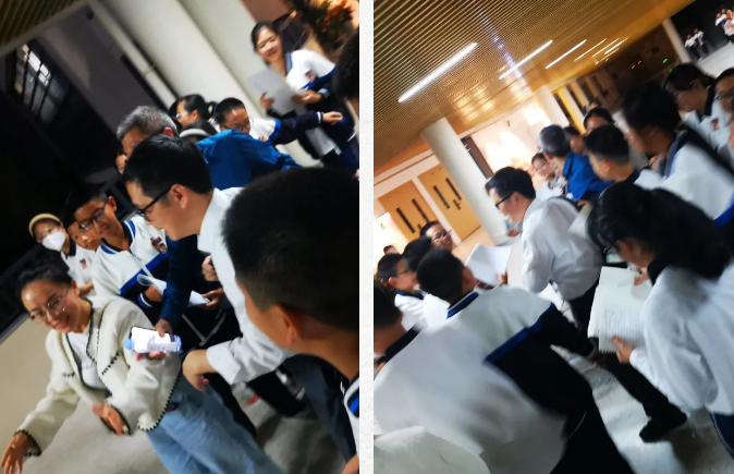 这组模糊的抓拍照片摄于10月12日晚,夜幕降临,大批绣中学生蜂拥追随着一位白衬衫的长者要签名,堪比大型追星现场。