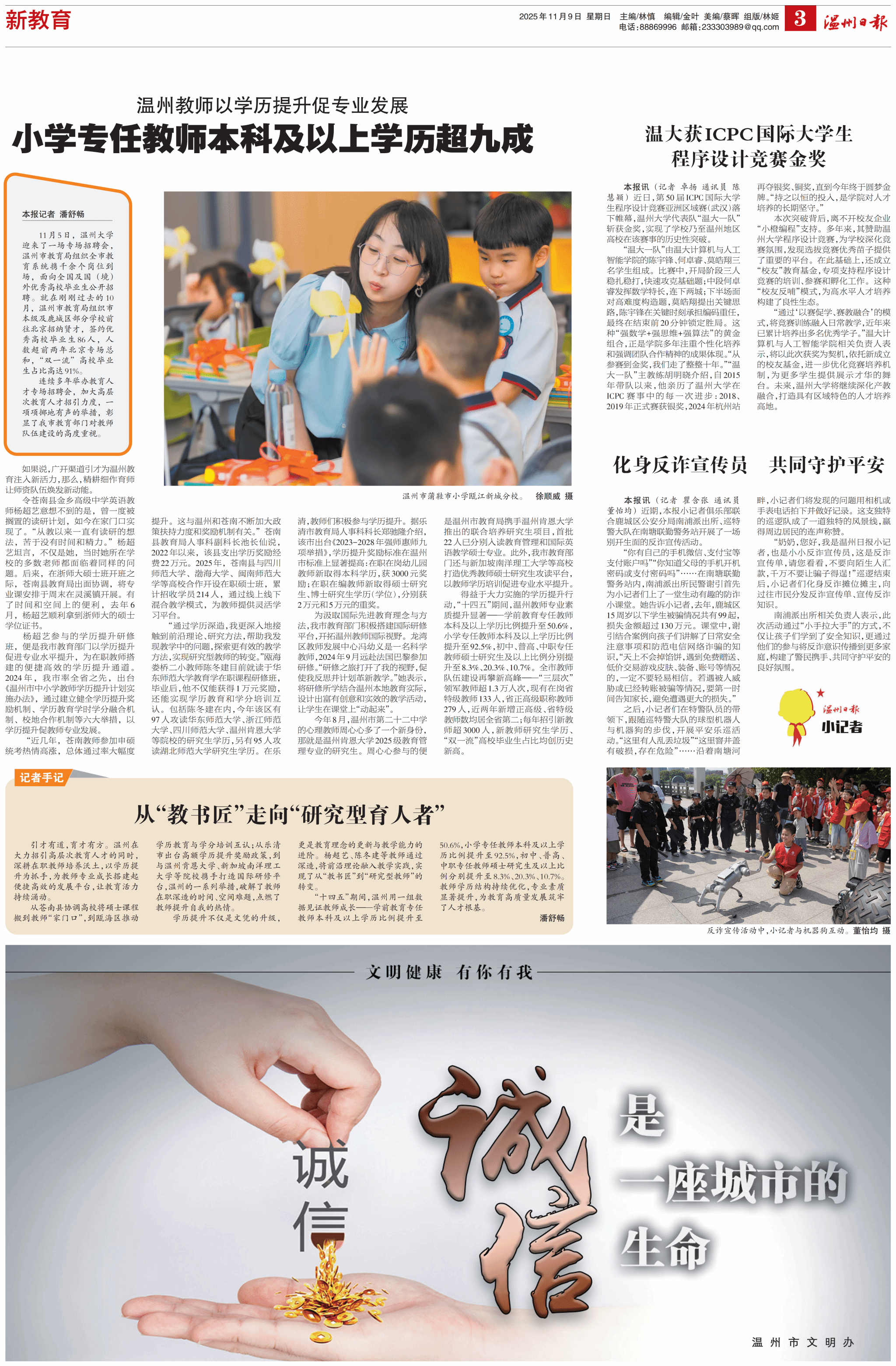 “通过‘以赛促学、赛教融合’的模式,将竞赛训练融入日常教学,近年来已累计培养出多名优秀学子。”温大计算机与人工智能学院相关负责人表示,将以此次获奖为契机,依托新成立的校友基金,进一步优化竞赛培养机制,为更多学生提供展示才华的舞台。未来,温州大学将继续深化产教融合,打造具有区域特色的人才培养高地。