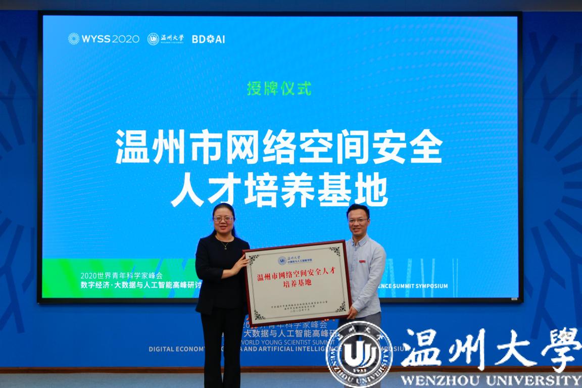 研讨会上还举行了多个平台的揭、授牌和签约仪式。市委宣传部副部长、网信办主任、市委副秘书长王丹、温州市发展和改革委员会副主任汪浩分别为“温州网络空间安全人才培养基地”、“浙南(温州)数字经济产教融合联盟”授牌。源于去年青峰会“大数据与人工智能论坛”的成果正式落地,浙南(温州)数字经济产教融合联盟成立,不单是温州各高校、数字经济骨干企业及行业协会共同努力的成果,也承载着政府部门的期待,联盟将为推动做大做强浙南地区数字经济发展做出更大的贡献。