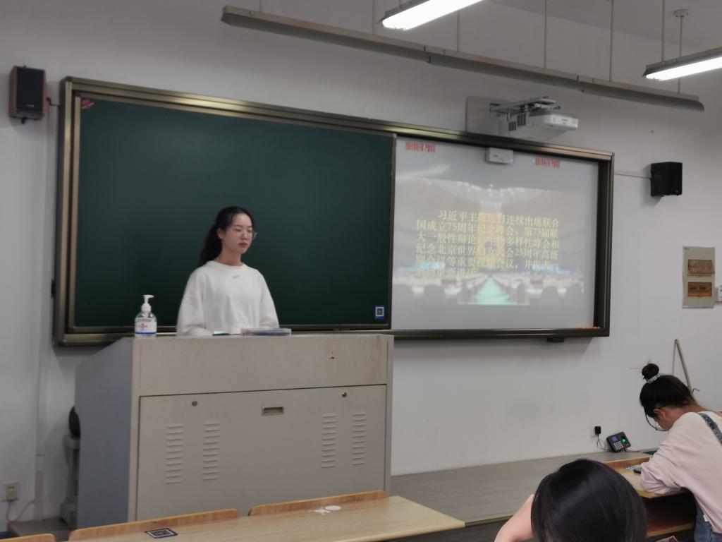 首先,冯煜瑶同学通过展示习近平总书记出席联合国系列高级别会议图片集锦,引发大家关于“后疫情时代联合国如何更好推进世界和平与发展大业”的思考与讨论,并学习了三个“坚定维护”。随后,大家一起了解了第75届联合国大会一般性议题,学习了由习近平总书记提出的“创新、协调、绿色、开放、共享的新发展理念”,及要致力于实现“既平衡又充分”的发展观点。接着,通过对巴西火灾,甘肃治沙等事件回顾,并通过一段视频学习了习近平总书记在联合国生物多样性峰会上提出四点建议,感受了习近平总书记呼吁国际社会坚持走绿色、低碳、循环、可持续发展之路,“努力争取2060年前实现碳中和”这一庄重承诺。并通过一段视频介绍纪念北京世界妇女大会25周年高级别会议,让大家对后疫情时代,更需关注妇女的特殊需要,提高妇女的社会地位急迫性有了深刻认识,在未来更需建设一个妇女免于被歧视的世界,打造一个包容发展的社会。